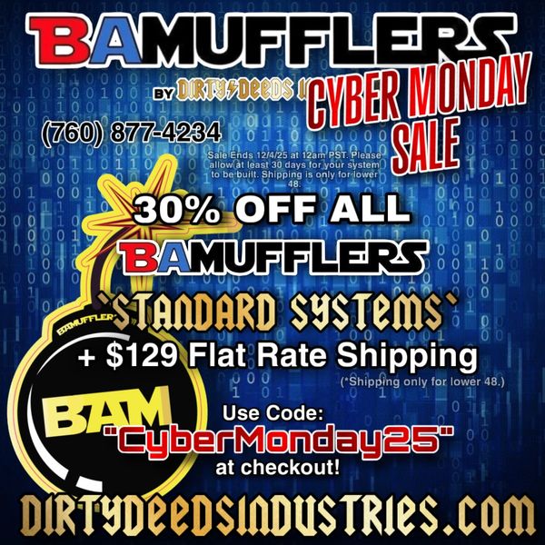 Check back often to see our ever changing group buys, blitz sales, and deep discounts on our exhaust systems. We also offer free shipping promotions on parts that Dirty Deeds Industries or BAMuffler does not build in house.